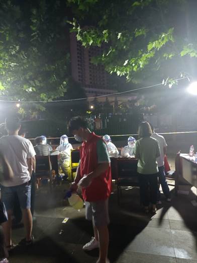 从8月1日下午4点半到8月2日凌晨5点半,两名同学在小乔社区核酸检测点连续奋战14个小时。“您好,请出示健康码……”“您好,请保持一米距离……”这样的对话已重复成千上万次,他们身着红马甲,手持大喇叭和消毒液,提醒检测市民佩戴好口罩,保持间隔一米距离,帮助引导老人和其他需要手机登记注册的市民登记,协助排查临检人员的健康码和预约码,保障临检队伍秩序等....从白天到黑夜,从凌晨到日出,两点“志愿红”从未停歇,而两人身上的衣服也早已被汗水浸湿。