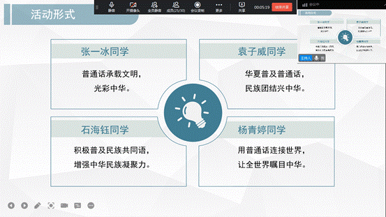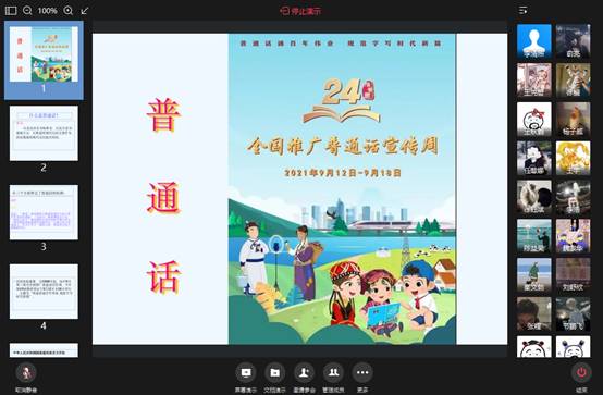 团会上,班级负责人表示各基层团组织应团结、引领广大团员、青少年做好示范带头作用,认真实现校园普通话语言环境以及青少年回家后带动家庭使用普通话语言目标,进而推动全社会推广普及普通话。其中,给排水182、建环193通过线上美文诗歌朗读推普,环境182开展线上语言文字知识比赛推普,建环19卓越线上展示普通话宣传标语推普,安全191开展线上普通话竞赛推普,给排水201通过绕口令小练习推普,建环203线上科普普通话等级考试相关事宜推普,能动201则用普通话朗诵习近平总书记发言推普……各班员工积极参与,主动交流,纷纷表示语言是重要的交际工具, 语言文字应用能力是人们进行社会实践活动的基本能力之一,说好普通话写好规范字能大力提升老员工的整体素养,我们都应为之努力,“说标准普通话,品浓浓华夏情”推普主题活动取得了积极成果。