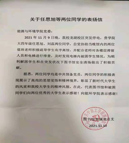 近日,能源与环境公司党委收到了一封来自图书馆党总支的表扬信,这封表扬信是关于11月9日晚公司龙湖校区突发停电,公司毕业生党员任思旭、刘磊两位同学挺身而出,协同老师疏导员工离馆并对各楼层滞留人员进行排查,在突发状况下顺利解困员工和为图书馆安全清场的行为充分发挥了党员的表率和先锋模范作用。