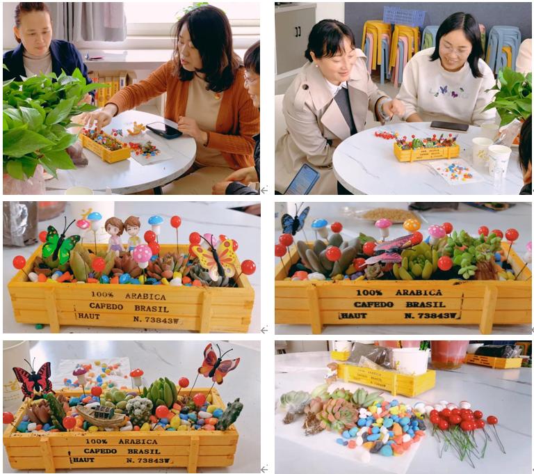 微景观制作大家都是第一次接触,由院分工会精心准备的多肉植物整齐的摆放在桌子上,活动还没开始女教职工们就表现出极大的兴趣和好奇。她们跃跃欲试,纷纷拿起小工具饶有趣味地种植起来。大家根据自身的喜好,随意搭配。经过填土、配色、种植、装饰等一个个步骤,不断释放自己的想象力与创造力。最终,一盆盆创意满满、各具特色的“纯手工盆景”完成了。女教工们更是按捺不住心中的喜悦,纷纷与自己的作品合影留念。