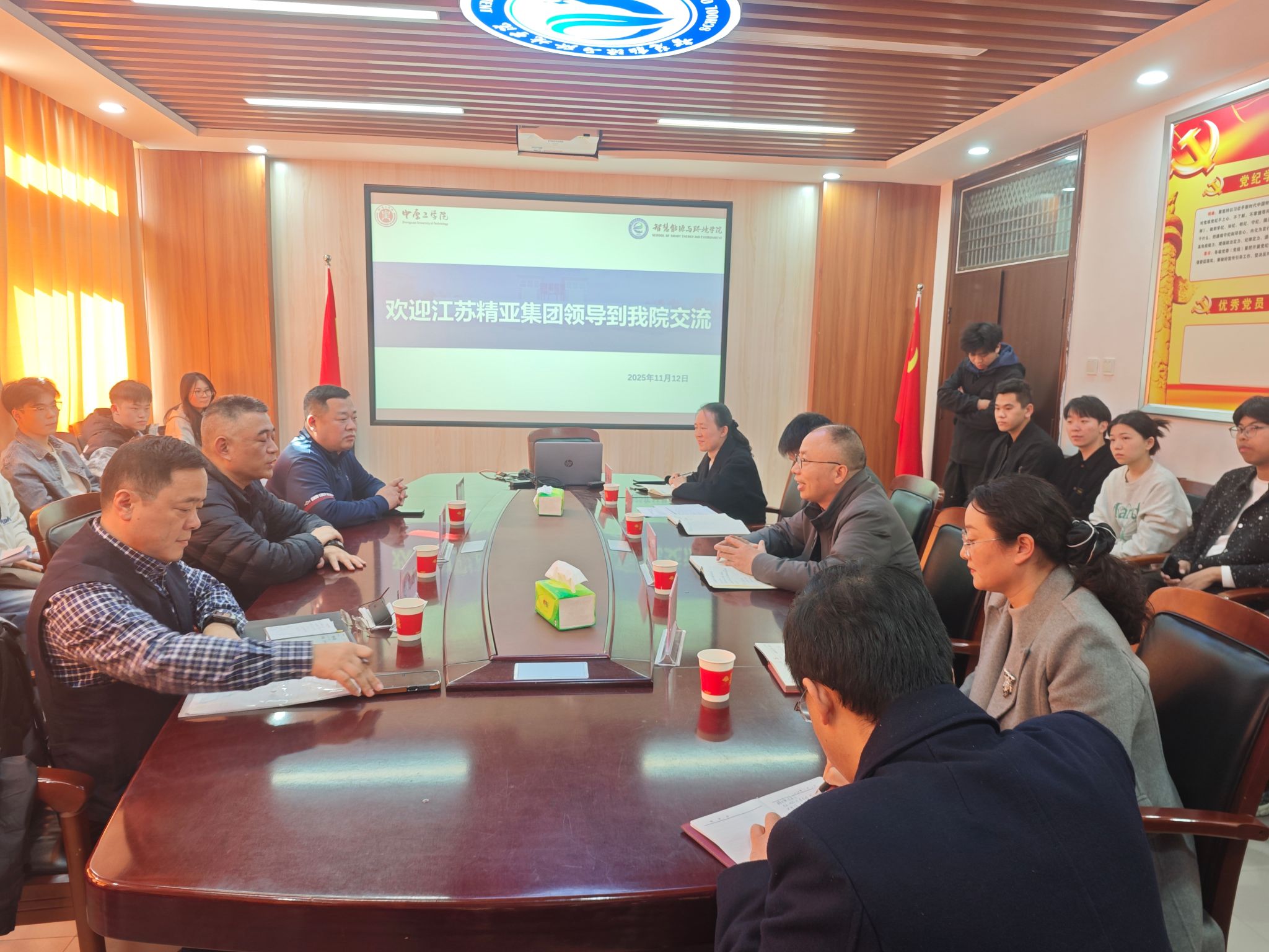 11月12日,江苏精亚集团总经理张新振,江苏精亚环境科技有限公司常务副总赵文龙,河南纺织建筑设计研究院轻纺工程院副经理王宏伟一行到访公司伟德体育官方网站,就校企产学研合作及员工就业等事宜开展深入交流。公司党委书记周华强,经理王方,副经理秦贵棉、窦艳艳及40余位本科生、研究生代表参加了交流活动。