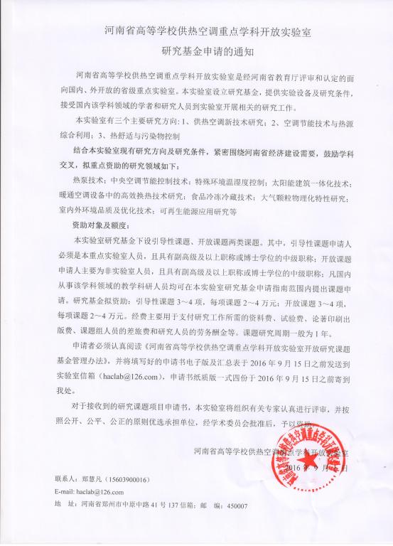 2016年度河南省高等公司供热空调开放实验室开放课题申请通知