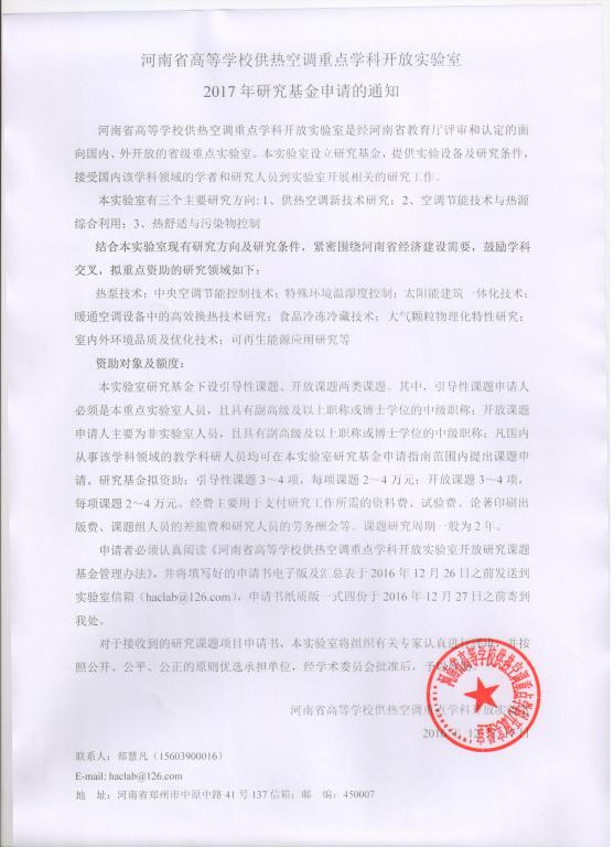 河南省高等公司供热空调开放实验室2017年度立项通知