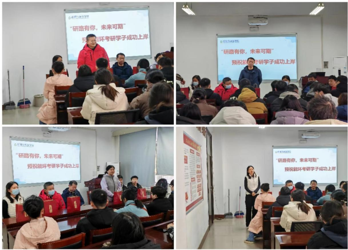 党委副书记卜伟刚为全体考研同学加油,叮嘱同学们保持良好心态,相信自己的能力,相信自己的每一份付出都会得到回报。毕业班辅导员向同学们强调考试相关事项,希望同学们做好充分的准备,以饱满的热情和坚定的信念迎接即将到来的挑战。全体老师逐一为考研学子们献上祝福。