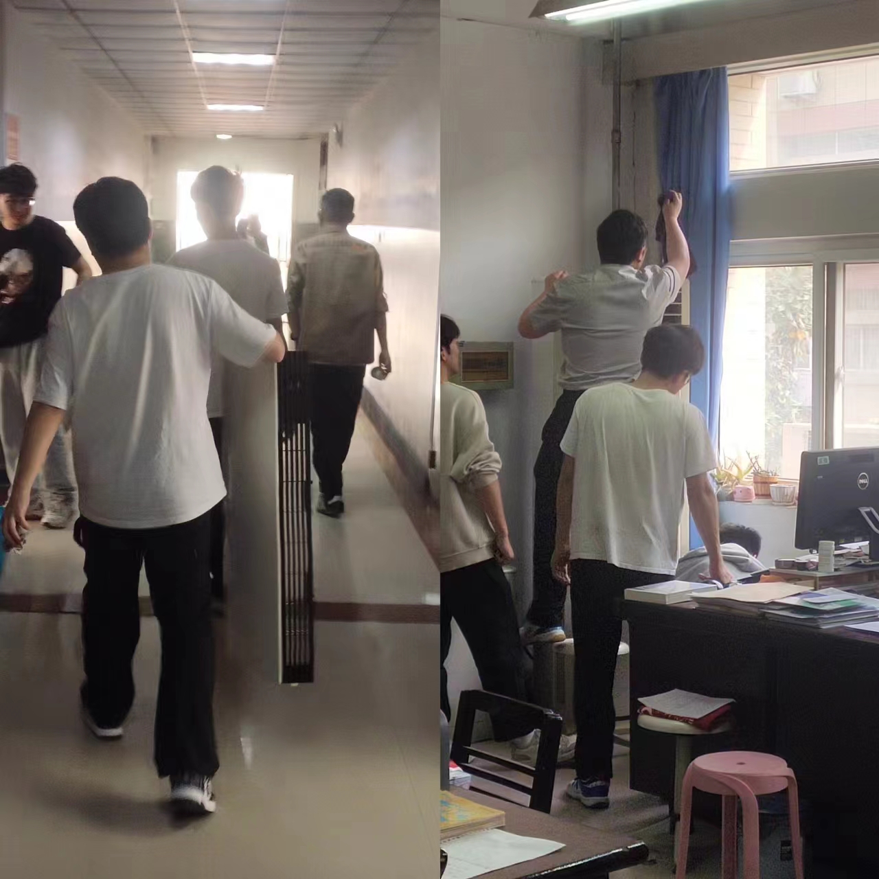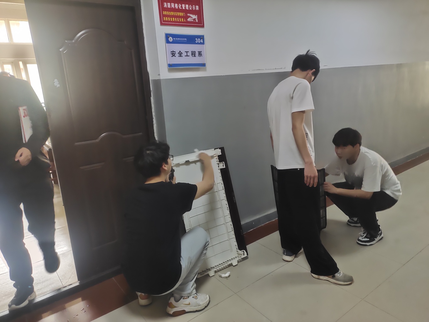 同学们热情高涨,争先恐后,积极报名参与其中。下午两点半,已有60余名志愿者在九号楼三楼集合。期间,小组分工协作、互相配合,利用所学专业知识和掌握的专业技能,对九号楼的办公室和实验室的空调进行了清洁和维护。在志愿者的共同努力下,空调变得洁净如新,师生的学习、工作环境得到了改善。