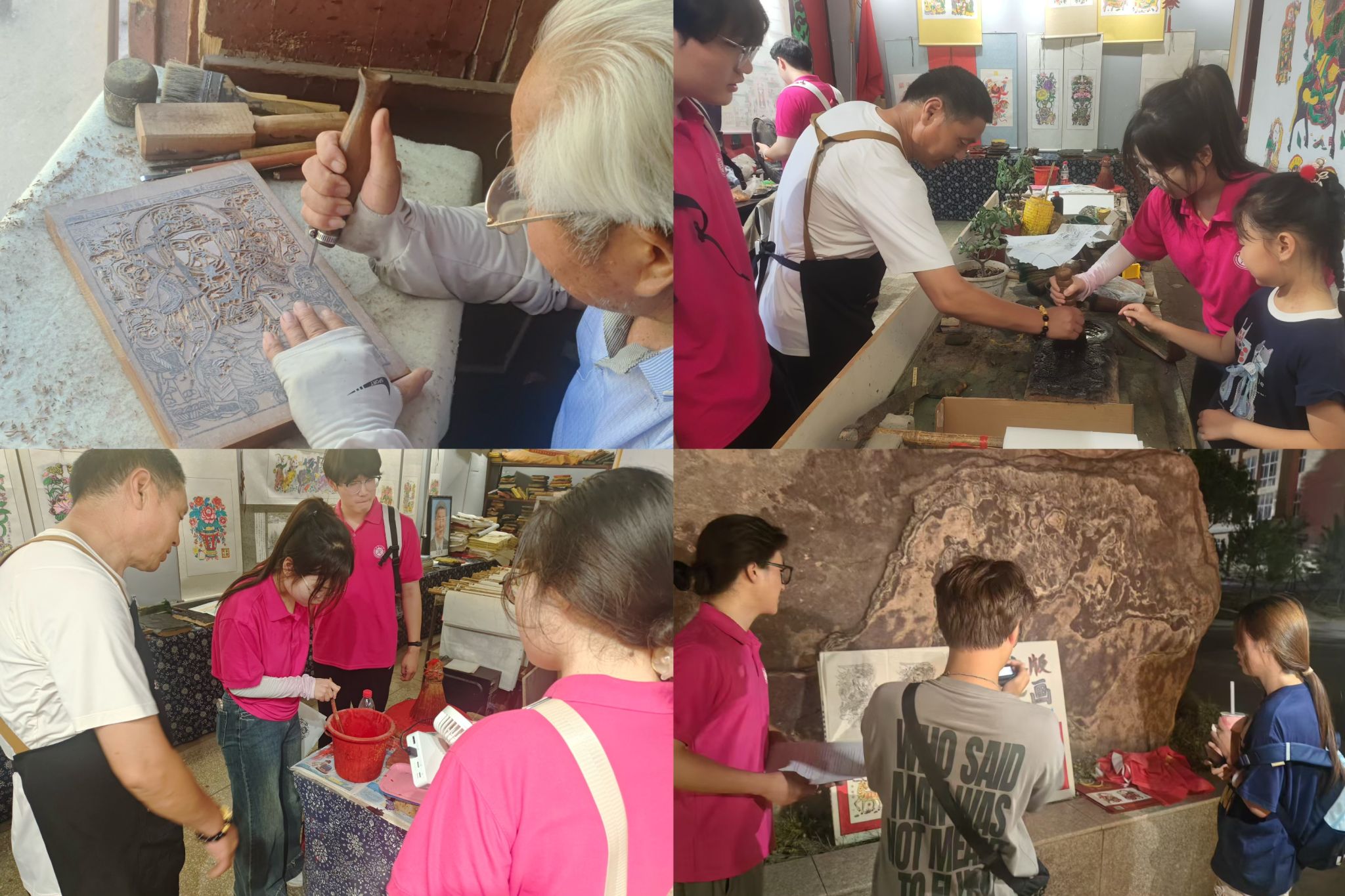 实践期间,队员们近距离观摩老师傅刻版:刻刀起落间,梨木板渐次浮现出灵动纹样,一刀一刻都凝结着数十年的深厚功力。队员们还亲手体验了涂墨与印刷工序——刷子蘸墨、雕版涂刷、宣纸轻覆、来回按压,待缓缓揭开时,一幅线条明快、色彩鲜亮的年画便跃然纸上,让大家真切体会到传统工艺的精妙。返校后,实践团在主干道布置展板,集中展出非遗工坊纪实照片及自印年画作品,通过讲述朱仙镇见闻,传递木版年画的艺术魅力与非遗传承的时代使命。