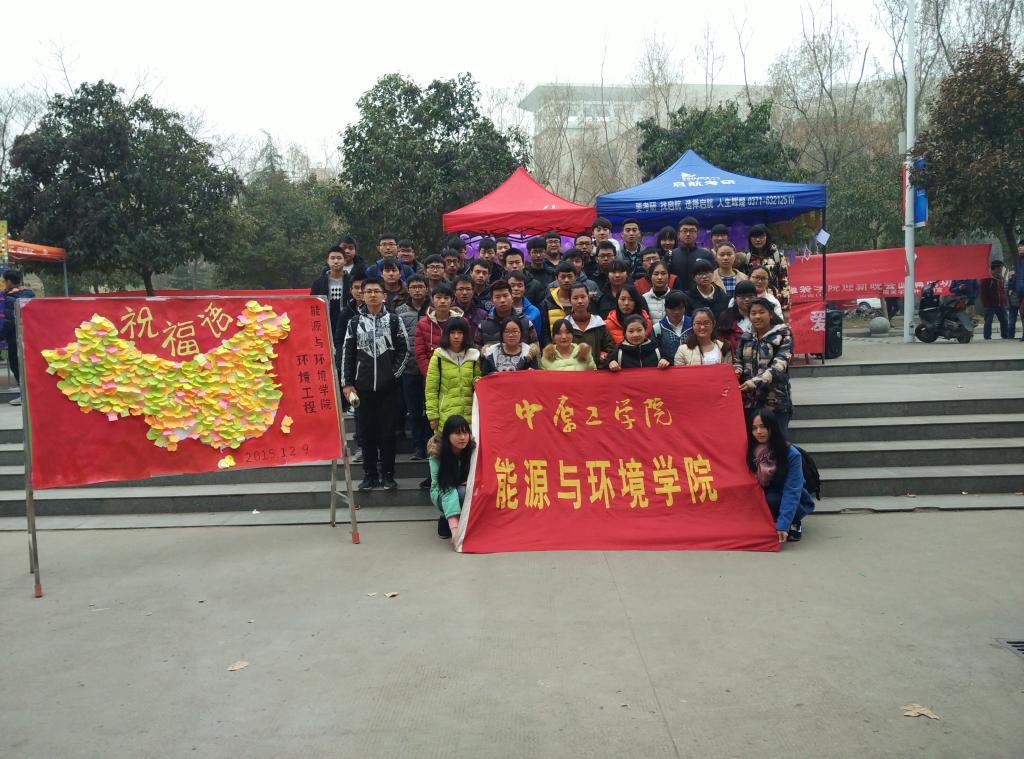 2015年12月9日,环境15级全体同学在南苑餐厅门口搭起帐篷,为祖国母亲收集祝福语,在帐篷两侧展出我们在二七广场参加团日活动的照片,校内同学纷纷来到我们的活动现场,为祖国母亲写下自己的祝福。活动最后,集体同学与承载着全校师生对祖国满满的祝福的展板一起合照一张!