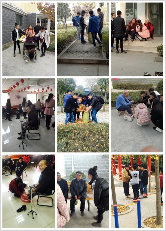 终于在2016点11月19号迎来的我们最期待的一天,我们踏上了公交车带着一个个充满爱的孩子去往敬老院的路上。一路的颠簸也丝毫没有削弱我们献爱心关怀老人的决心!我们怀着真挚之心,带着慰问品来到了敬老院,老人们热情欢迎同学们的到来,我们的到来使原本寂寞的敬老院充满了欢声笑语,一片其乐融融,一切事物都是那么的祥和而又充满生机!每个人都各尽所能,男同学们帮助他们清扫树叶,力所能及地将他们的生活环境更加美好!还有为他们剪指甲,分发面包和水果等慰问品,老人们都非常感动,同学们和老人自由交谈的同时认真倾听老人们讲述着改革开放前后的个人经历,令同学们了解到了我们今天幸福生活的来之不易!通过交谈也让老人们看到了幸福的曙光,再一次感受到了温暖!