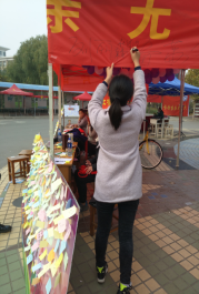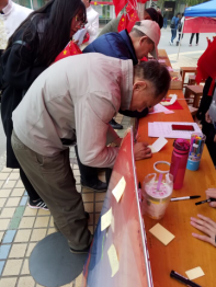本次活动由“寄语留言”、“条幅签名”、“有奖竞答”三个部分组成。在上午的寄语留言活动中,同学们围绕着祖国从1949年以来的所做出的伟大贡献,写下自己对祖国母亲的尊敬与爱戴之意。同学们在表达自己的爱国情怀的同时,表现出了当代老员工应该有的风范与修养,也体现了当代老员工对社会、历史、人文与情感的关注与思考。条幅签名环节全专业人员一同走到条幅前,有秩序地进行签到,之后邀请同学们上前一同签名,将整个活动推向高潮。在上午的活动中,人员分工明确,各司其职,整个活动井然有序的进行,最终取得了圆满的成功。