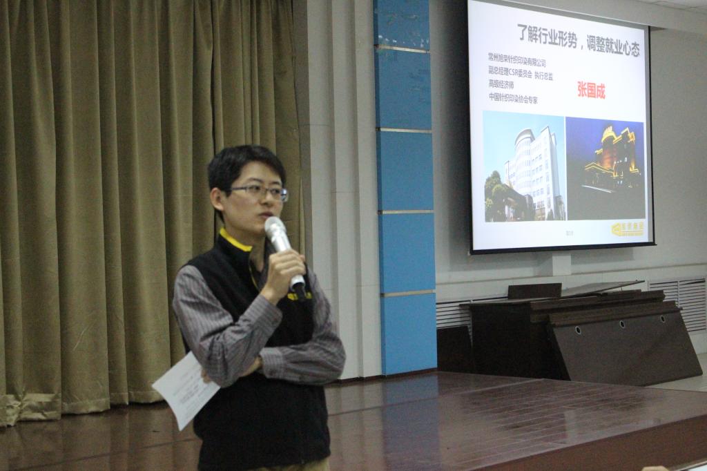 会议开始,旭荣针织印染有限公司副总经理、中国针织印染协会专家张国成先生首先为我们讲述了当前的行业形势以及我们老员工应具备的就业心态及素养。随后,他强调了本次招聘的人员必须具备的3大条件,会干活、会吃苦,会动脑。同时,张经理也很清楚的表明其公司需要的是知识性的年轻人。