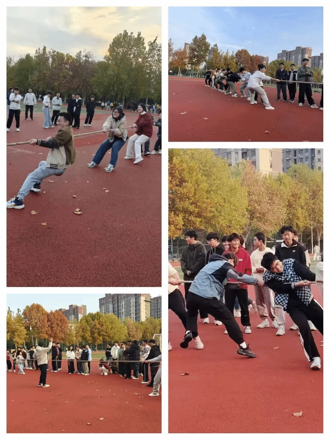 赛场上,拔河绳像一条蓄势待发的巨龙。两边的队伍紧握绳索,眼神坚定,那是对胜利的渴望。随着哨声响起,肌肉瞬间绷紧,他们的双脚如同生了根一般扎在地面。呐喊声、助威声交织在一起,仿佛要冲破云霄。每一次的拉扯都是力量的角逐,每一滴汗水都是团结的证明。这不仅仅是一场拔河比赛,更是集体力量的盛大狂欢。层层比赛,场场精彩,激烈角逐,最终建环242获得第一名,能动242获得第二名,给排水241获得第三名。