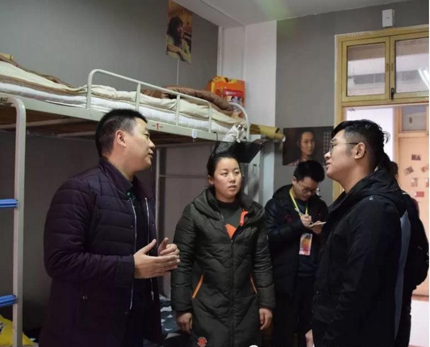 随后,张海斌书记一行深入同学宿舍,开始了宿舍视察工作。首先视察了同学们的住宿卫生及宿舍安全状况,强调了禁止使用违章电器的重要性,同学们应提高宿舍的安全隐患意识,避免给人身和财产安全带来不必要的麻烦。