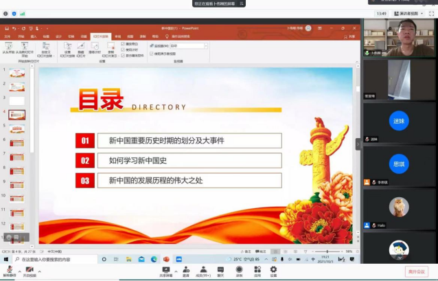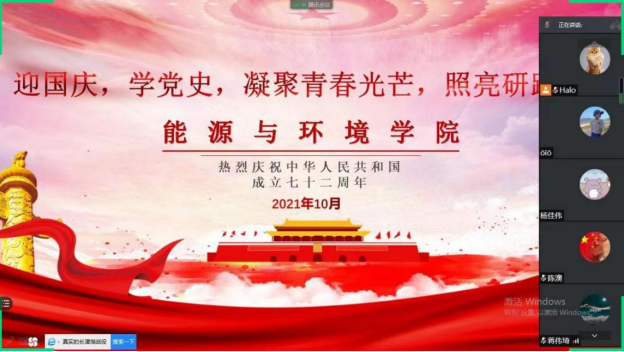 以史鉴今、资政育人,重视从党的历史中汲取智慧和力量是中国共产党的优良传统。为进一步加强“四史”教育,帮助员工从“四史”中汲取智慧和力量,10月3日晚,能源与环境公司通过开展“迎国庆,学党史,凝聚青春光芒,照亮研路远方”线上主题活动的方式来祝福伟大祖国72华诞。能源与环境公司党委书记郑慧凡、副书记卜伟刚、2018级辅导员余妍及近百名员工参加此次活动。
