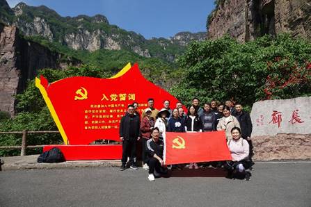 在郭亮村,大家通过徒步穿越人工开凿的1250米绝壁长廊——郭亮洞,郭亮村十三名党员,十三条汉子,十三壮士战太行,四支铁钎,八把大锤,在太行山的悬崖峭壁上奏响了凿山开路的最强乐章,大家被当地干部群众不畏艰险、百折不挠、不怕牺牲的精神所震撼;通过参观郭亮老村,对比郭亮新村,感受郭亮人战天斗地带来的生活变迁;通过穿越丹分沟,深刻体会绿水青山就是金山银山的理念和生态文明带来巨大经济价值。期间,参加此次党建活动的党员站在绝壁长廊前,面向党旗庄严宣誓,用铮铮誓言砥砺初心。