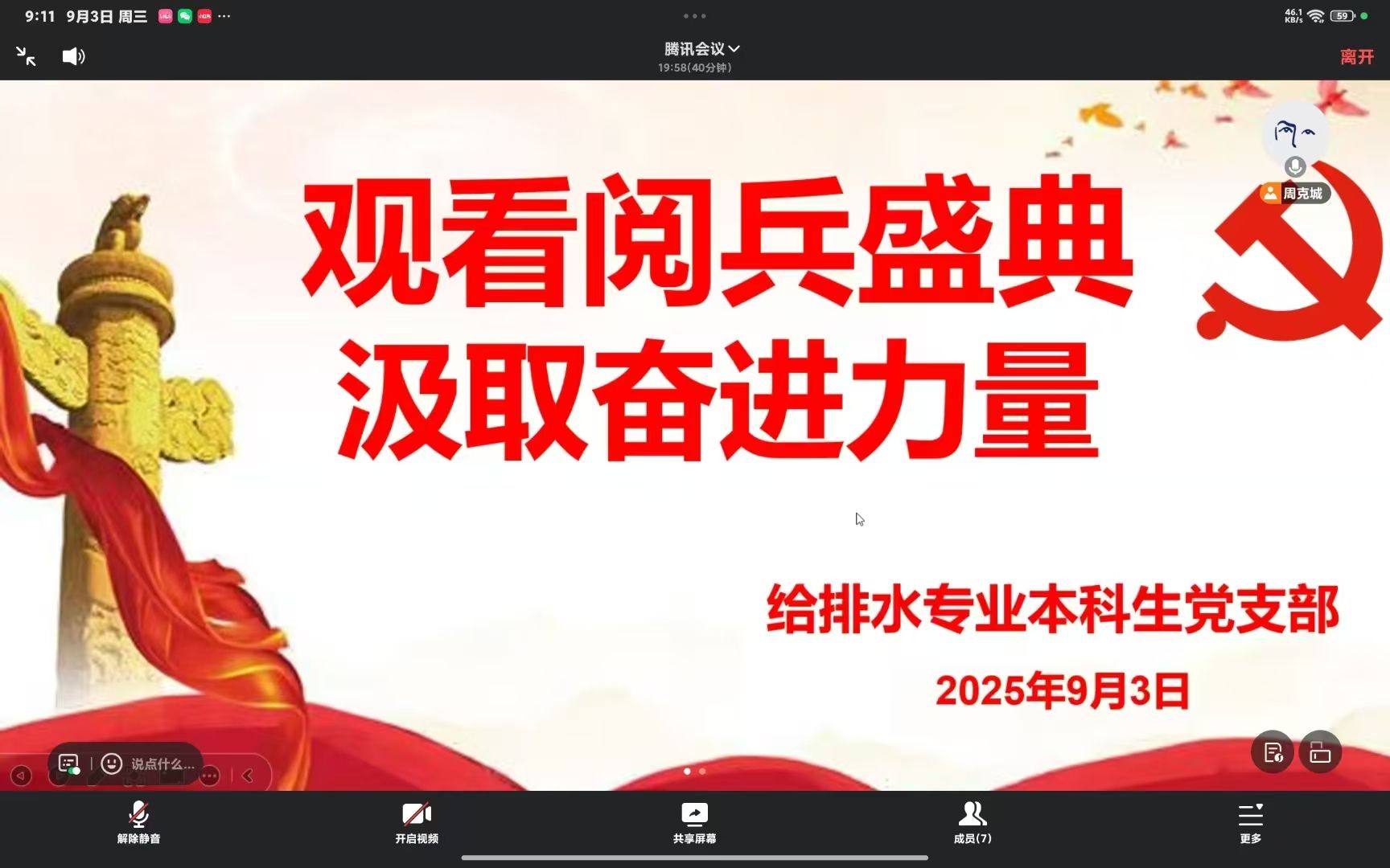 9月3日上午,纪念中国人民抗日战争暨世界反法西斯战争胜利80周年大会在北京天安门广场隆重举行。为铭记历史,缅怀先烈,弘扬爱国主义精神,伟德体育官方网站给排水本科生党支部组织线上集中观看阅兵仪式直播盛况,共同见证这一庄严而激动人心的历史时刻。